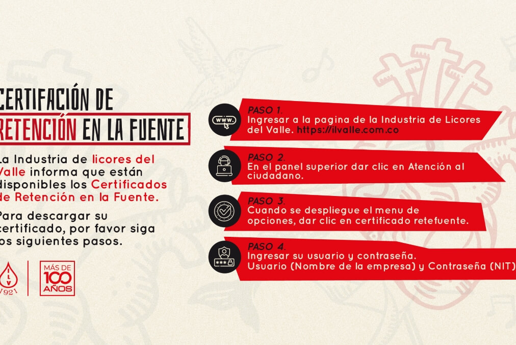 La Industria de Licores del Valle (ILV) informa a todos sus clientes, proveedores y comunidad interesada, que ya se encuentran disponibles los Certificados de Retención en la Fuente correspondientes. Para facilitar su descarga, la ILV ha dispuesto una herramienta virtual a través de su sitio web oficial. A continuación, se detallan los pasos para obtener […]